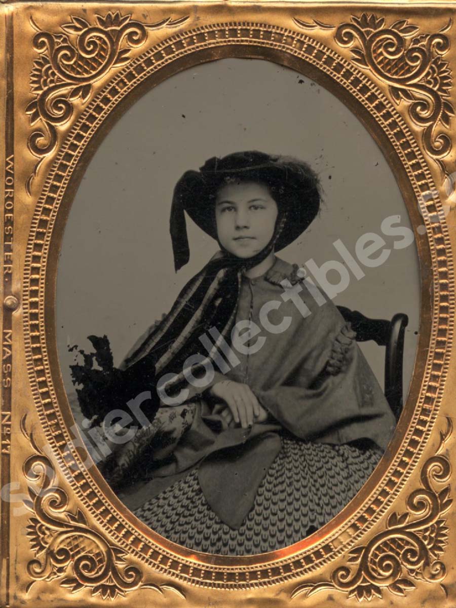 1/9 plate ruby ambrotype in a full leatherette case. She wears an elaborate hat with feathers and bows. Lost emulsion on lower left. Well focused and crisp. #14130=$100.00