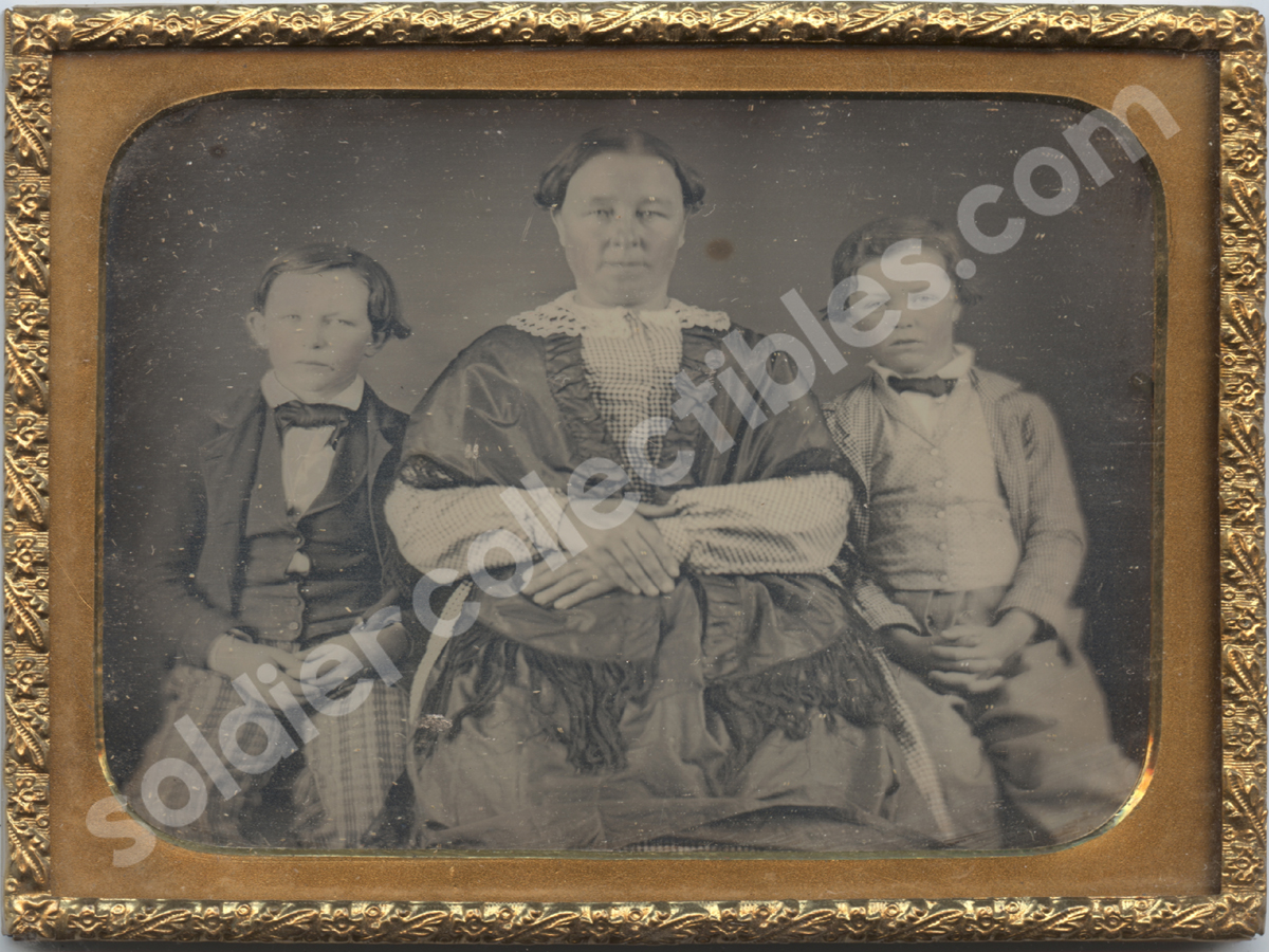 1/6 plate daguerreotype featuring Mom with her two boys. You can tell by the facial features (particularly the eyes) that these are clearly related to her. The horizontal format is a bit different. The image is crisp and clear and comes in a full leatherette case. #3513=$85.00