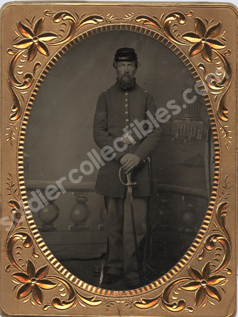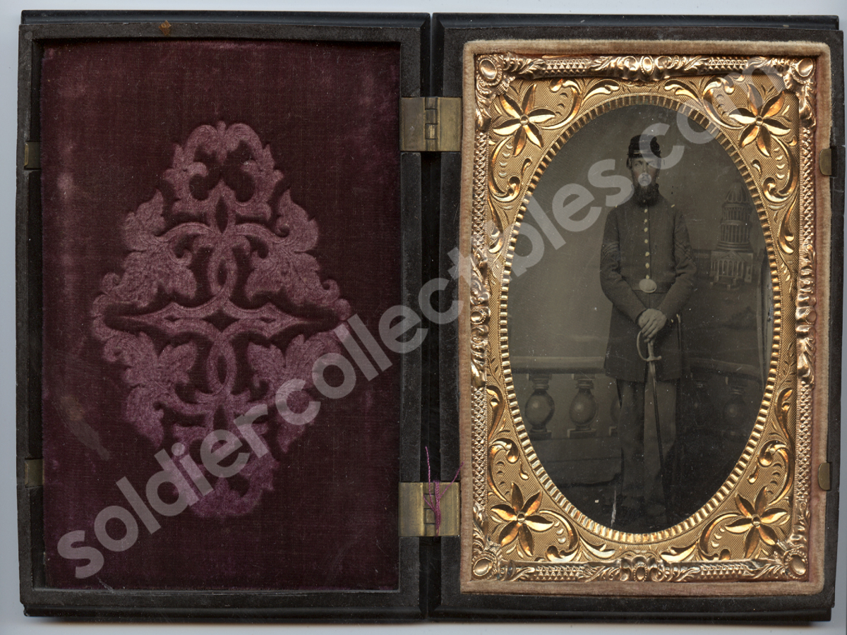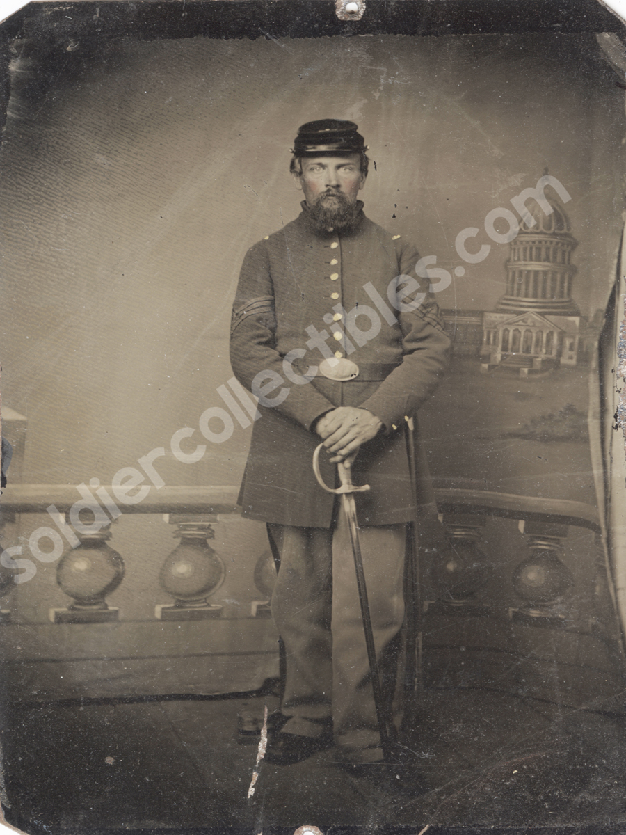 Published in my book "Civil War Hard Images Volume 2 - Union", this narrowly trimmed 1/4 plate tintype has a canvas backdrop with what is probably the US Capitol. Note how the canvas is rolling up on the image with no mat. This sergeant holds his NCO sword out for display and has the scabbard attached to his hip. The frock coat has the brass attachments for shoulder scales making this a likely early war image. There is no I.D. This image comes in a beautiful thermoplastic case that is in nearly perfect condition. #3833=$650.00