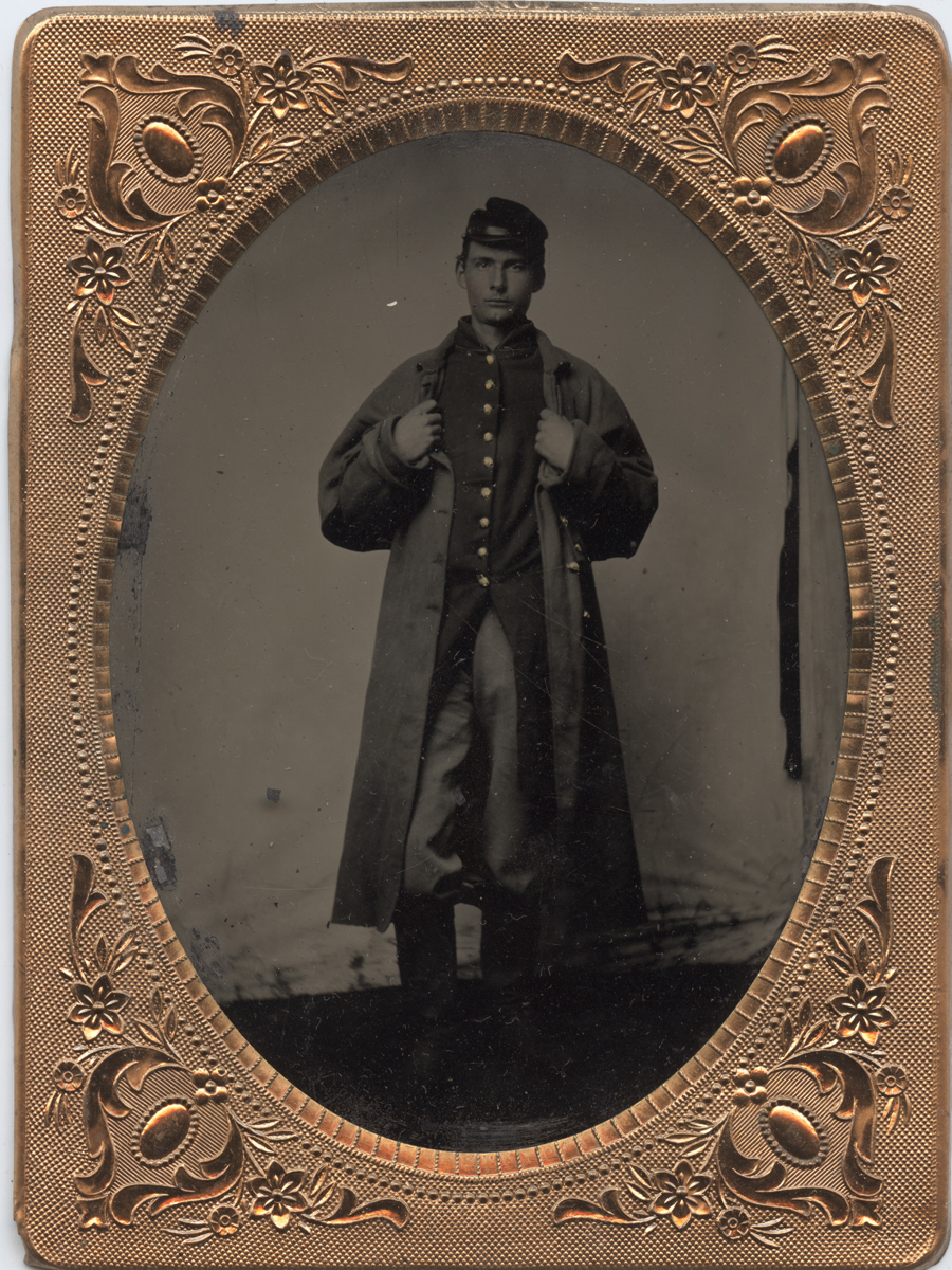 Already wearing a frock coat and kepi, this soldier also wants to display his great coat for the family