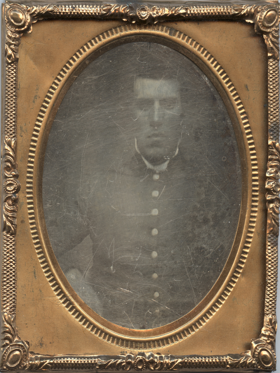 Wearing a tightly fitting shell jacket, this soldier likely is from the Mexican War era military. The 1/6 plate daguerreotype has some swipes that can be seen in the scan. There is no