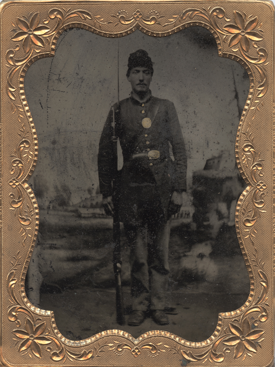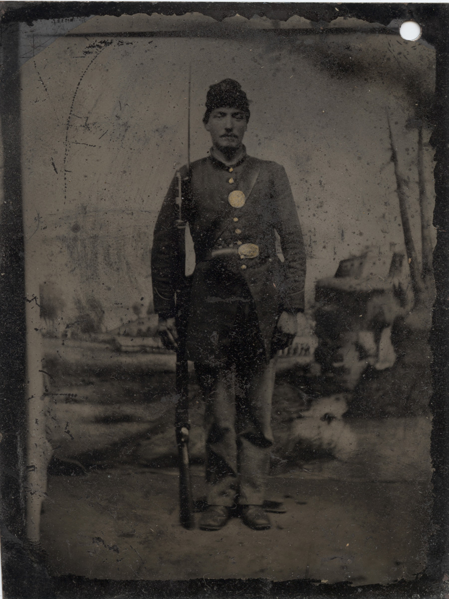 tintype is a bit darker then I would prefer, hence the price. He's wearing a frock coat, kepi, US belt plate and Eagle