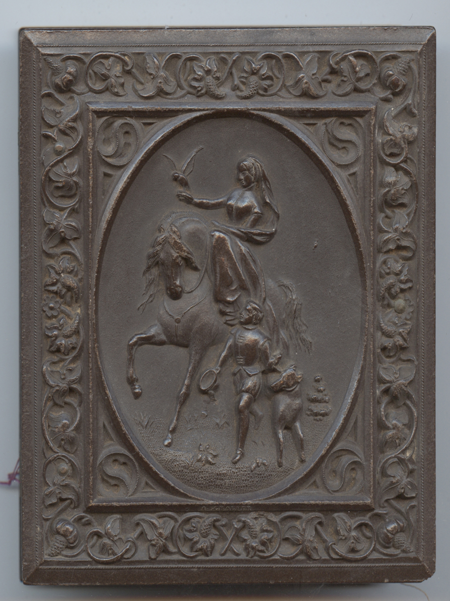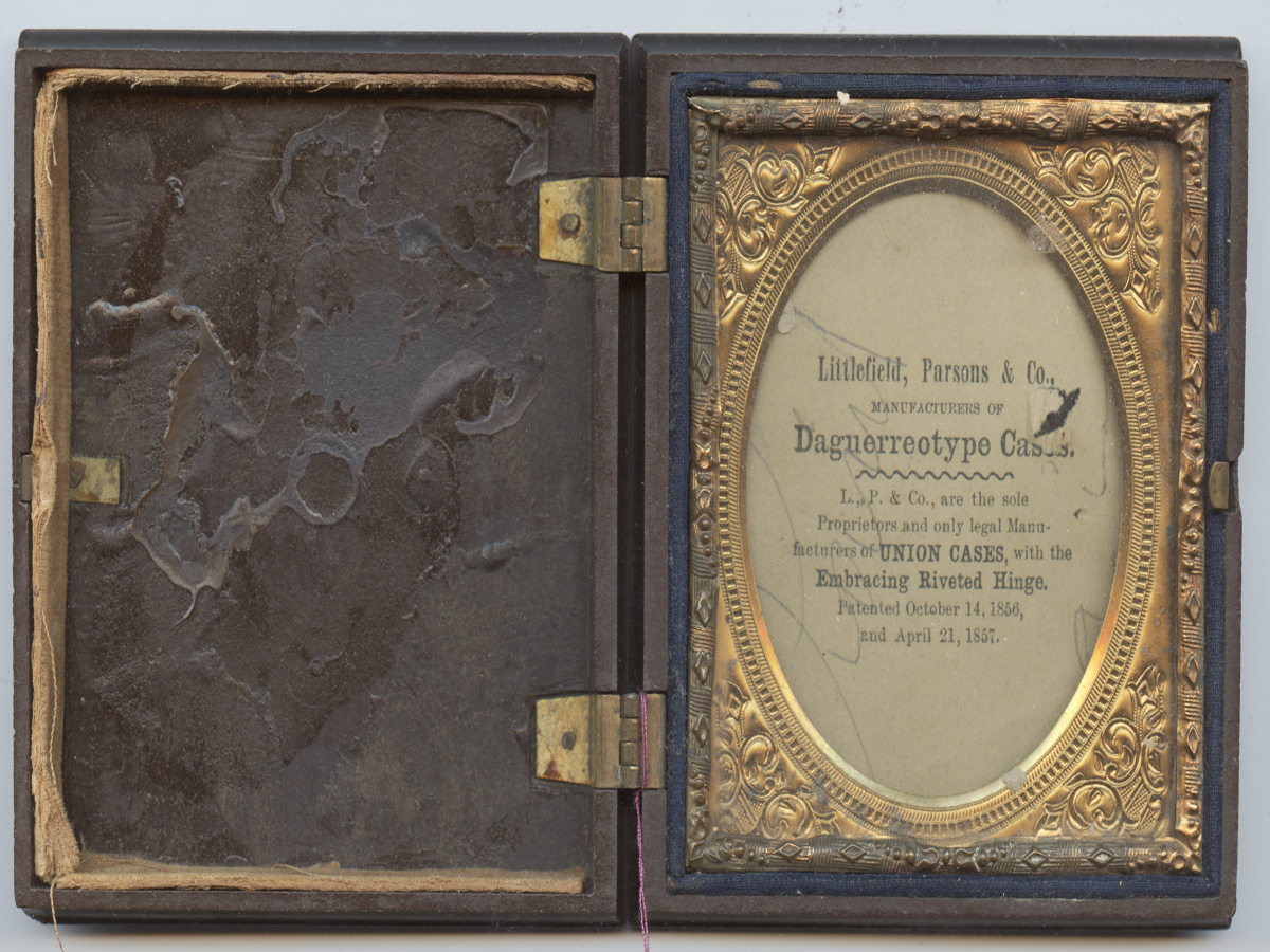 "Lady with Falcon" 1/6 plate. Tight hinges, chipped clasp. Overall, a very nice case. Double image case with one mat. #10266 - $175.00