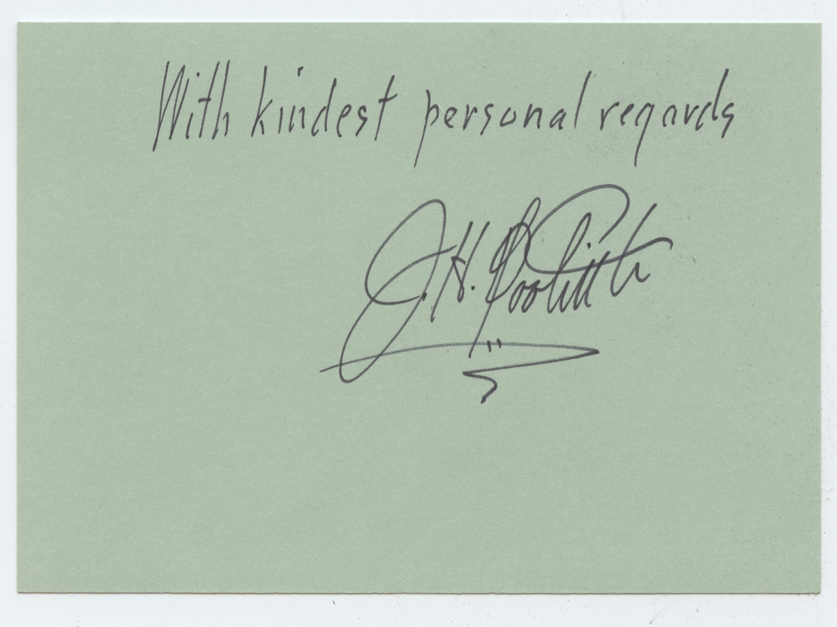 James Harold Doolittle (December 14, 1896-September 27, 1993) was an American military general and aviation pioneer. He made early coast-to-coast flights, won many flying races, and helped develop instrument flying. He wasa flying instructor during World War I and a Reserve officer in the United States Army Air Corps, but he was recalled to active duty during World War II. He was awarded the Medal of Honor for personal valor and leadership as commander of the Doolittle Raid, a bold long-range retaliatory air raid on some of the Japanese main islands on April 18, 1942, four months after the attack on Pearl Harbor. The attack was a major morale booster for the United States, and Doolittle was celebrated as a hero. 6" x 3" card signed. $25.00